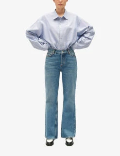 - High rise, A-line shape, contrasting trims, faux-pockets with button detail, all-over logo