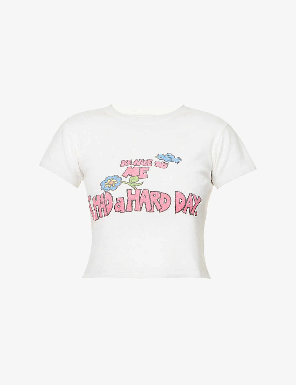 - Slim fit, round neck, ribbed trim at neck, short sleeves, brand print at front, cropped