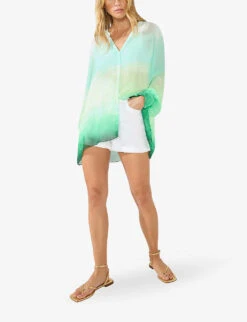 - Relaxed fit, short flutter sleeves, button front, self-tie hem