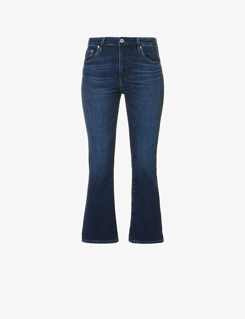 - Slim fit, high rise, flared leg, structured waistband, belt loops, brand tab at front, five pockets, V-shaped yoke at back, brand patch at back, mid-faded wash, branded silver-toned hardware, cropped
