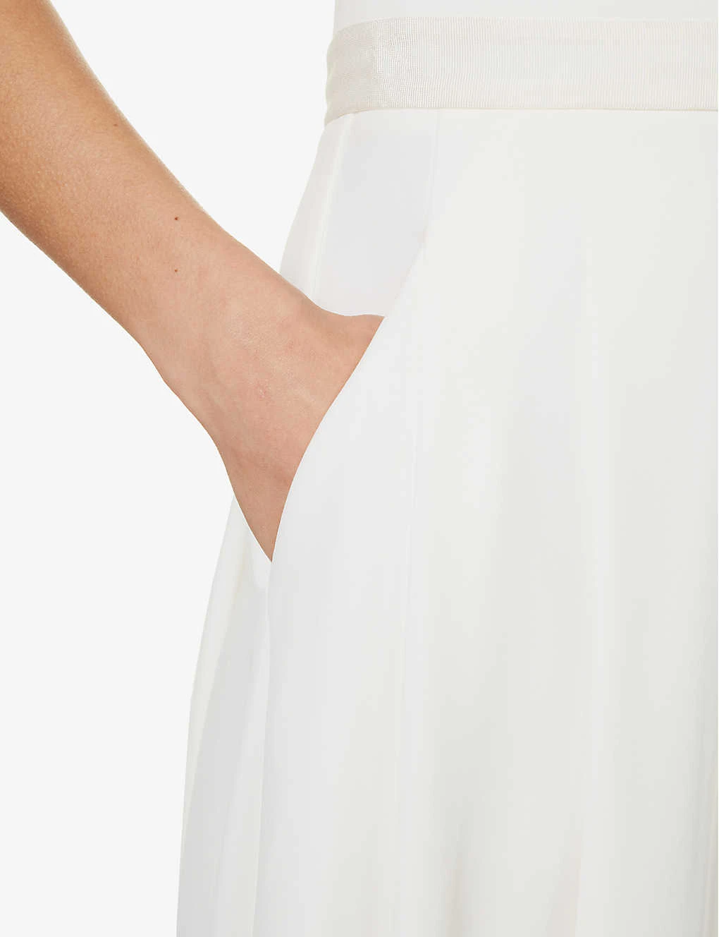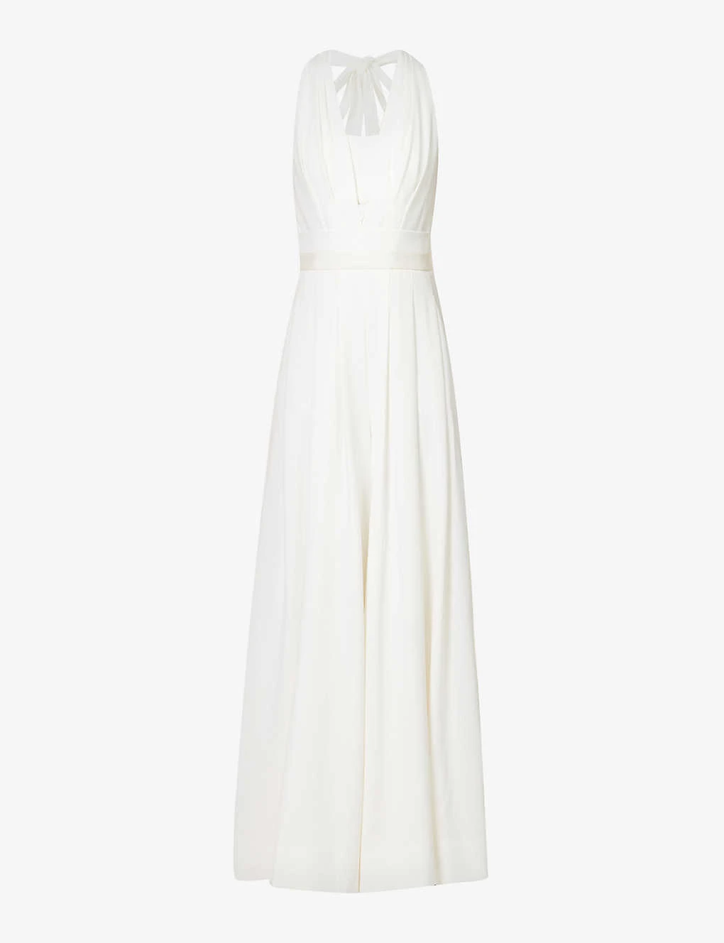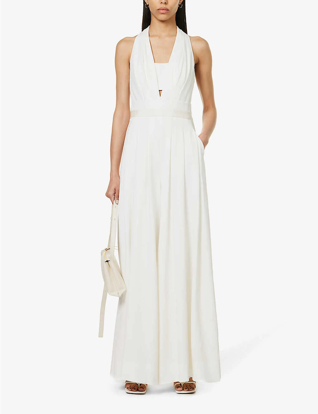- Regular fit, V-neckline, halter straps, wide pleated leg, sleeveless, structured waistband, two slip pockets at front, darts at back, two welt pockets at back, shirred panel, open back