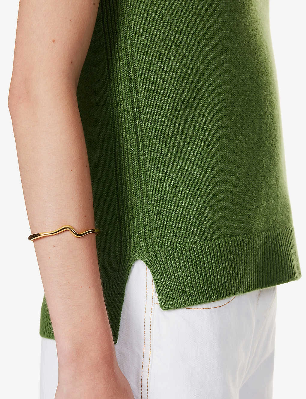 - Relaxed fit, V neck, sleeveless, all over knitted, split at sides, ribbed trims, elasticated hem