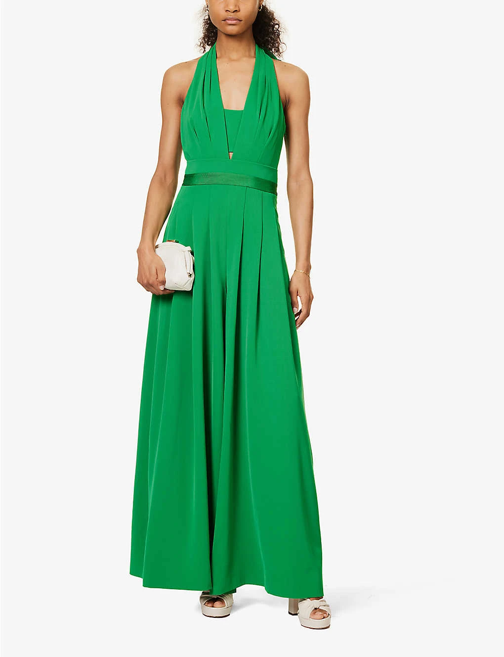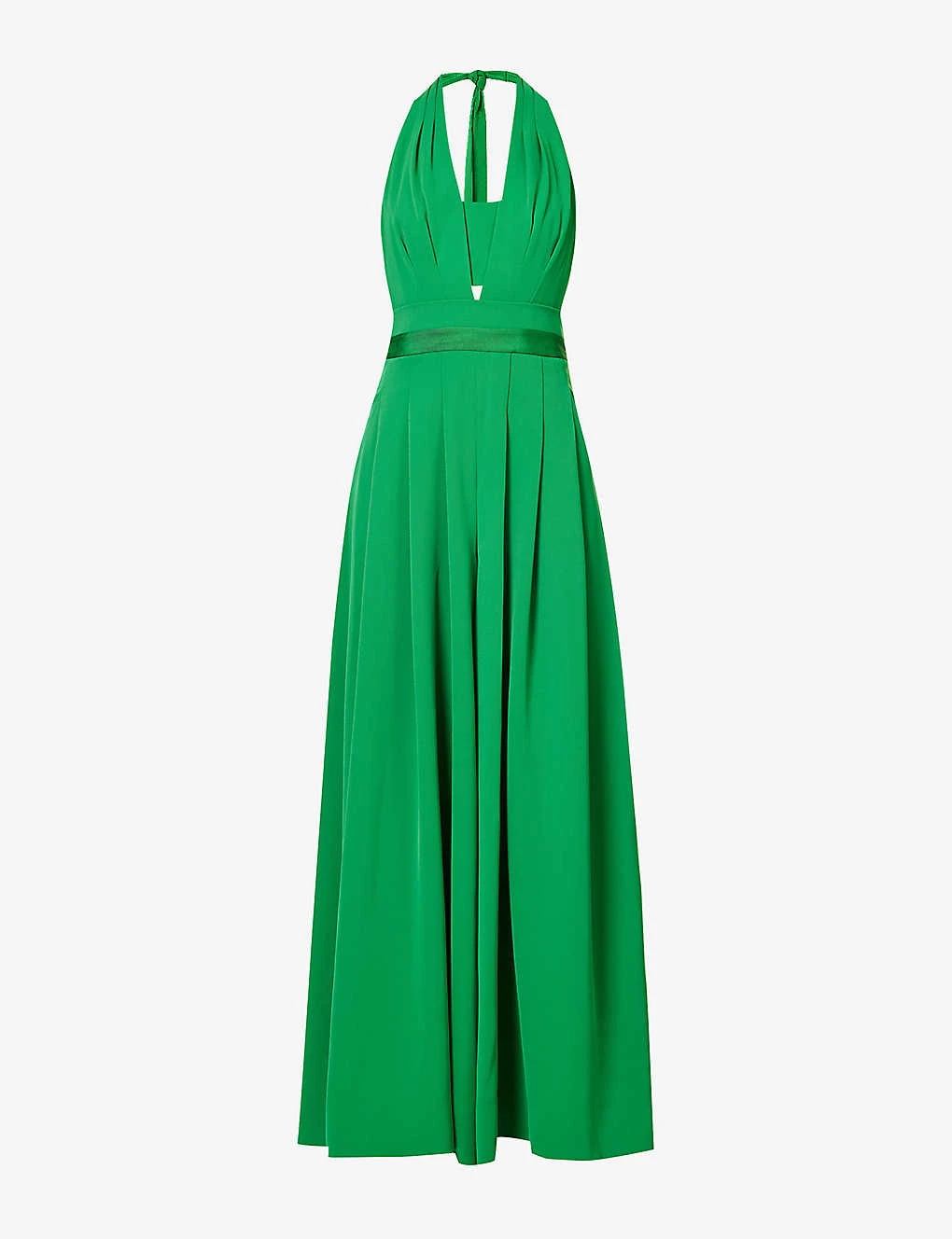 - Regular fit, halterneck, plunge V-neck, sleeveless, wide leg, two slip pockets at front, pleats at front, shirred panel at back, darts at back, welt pocket at back