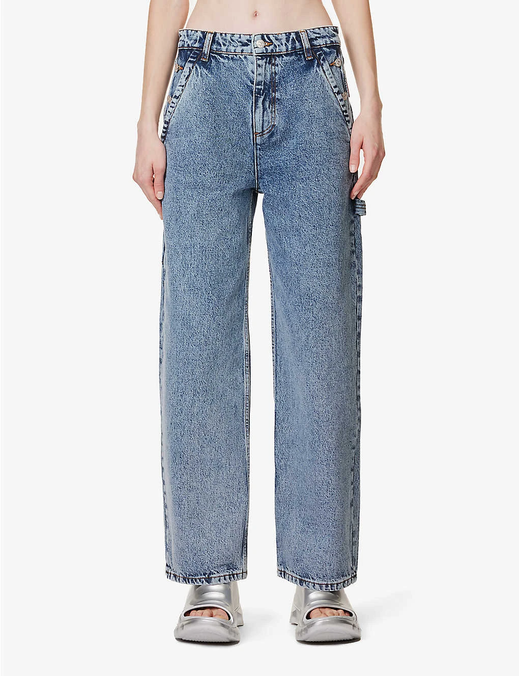 - Exposed button and concealed zip-fly fastening at front