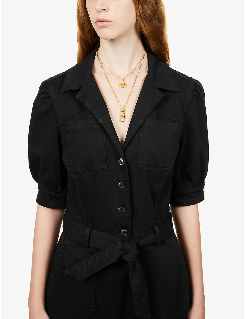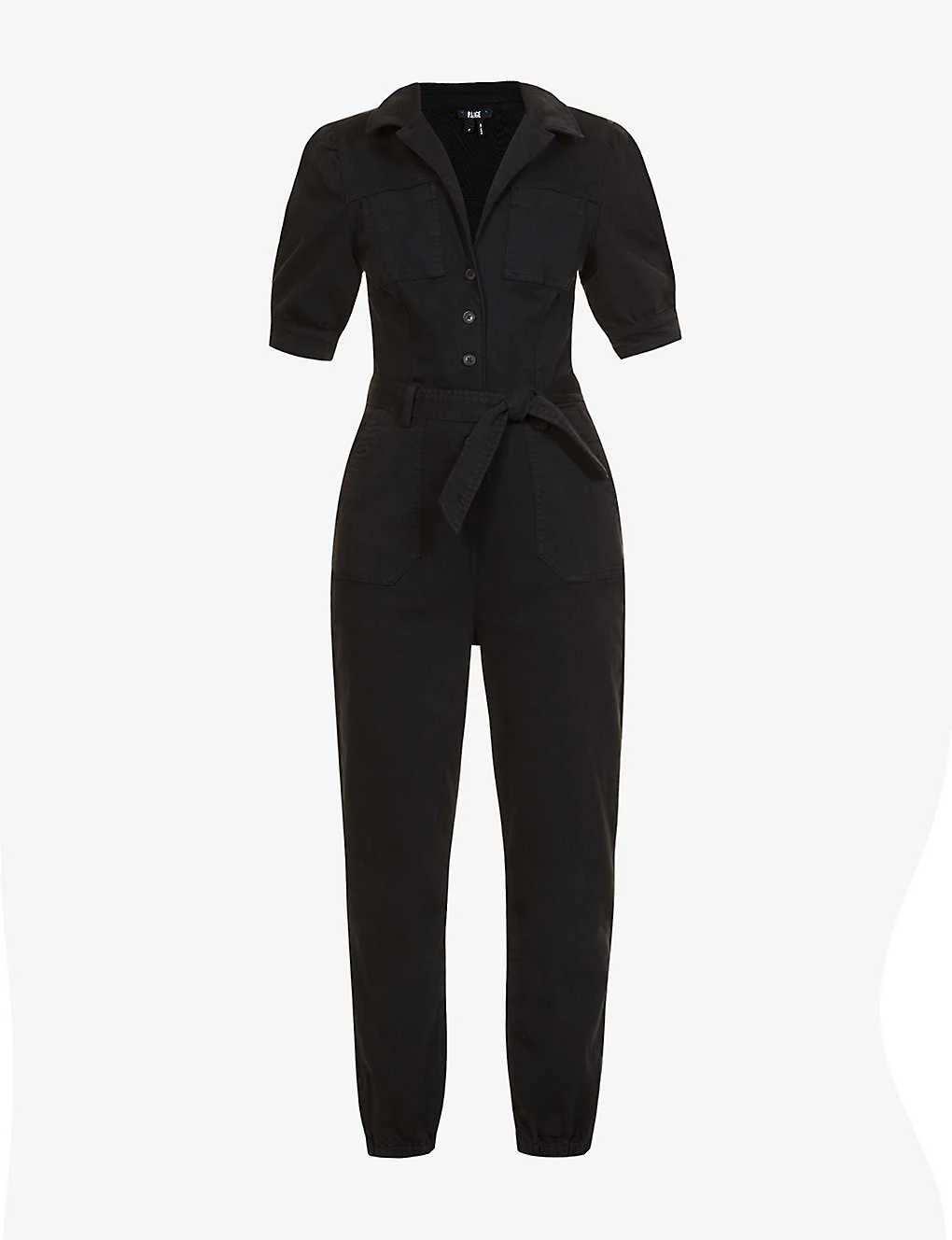 - Slim fit, V neck, notch lapels, puffed shoulders, short sleeves, buttoned at cuffs, two slip patch pockets at chest, two slip pockets at front, belt loops, removable self-tie fastening belt, stitched creases, straight yoke at back, two patch pockets at back, tapered leg, zipped at elasticated cuffs