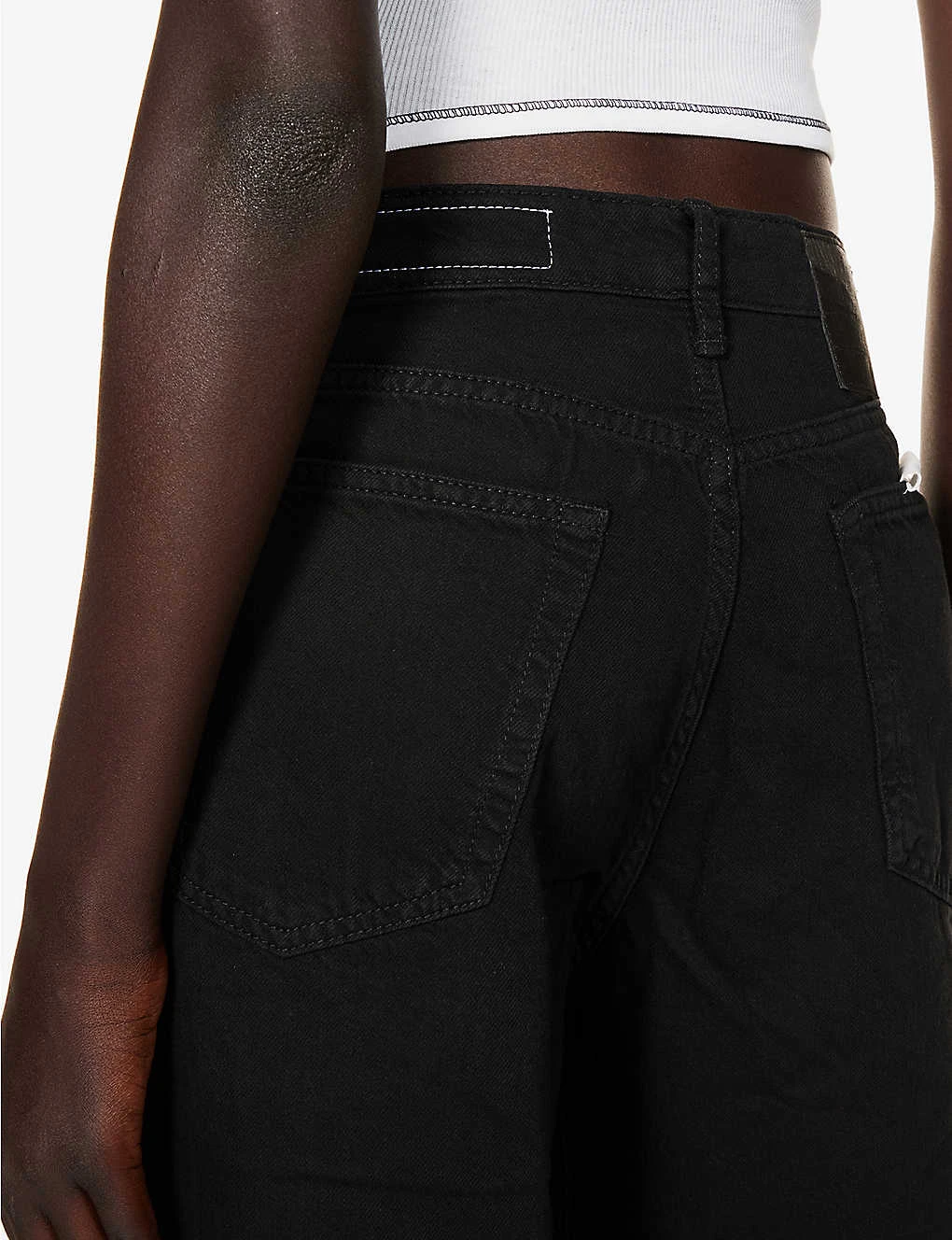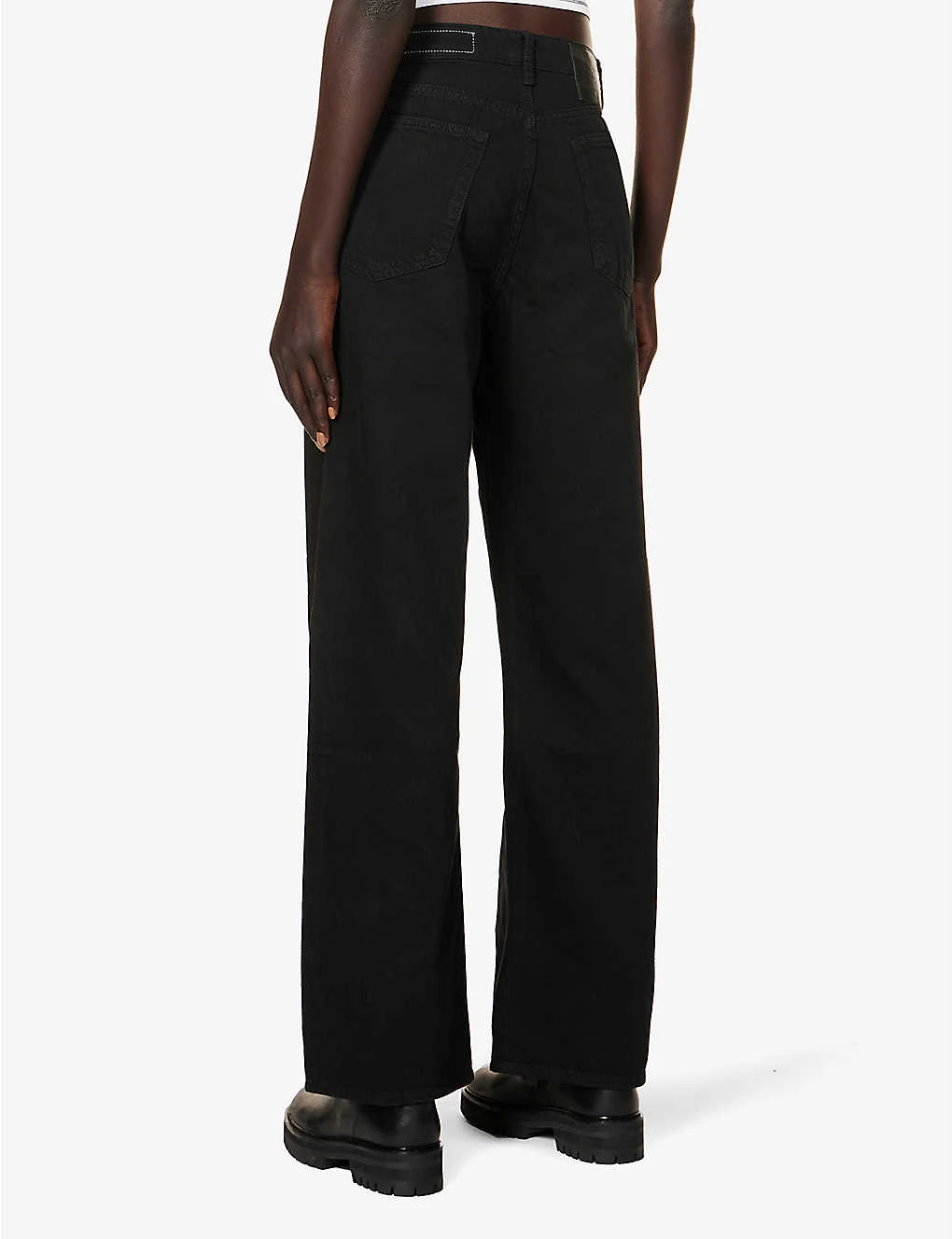 - Straight fit, high rise, wide leg, belt loops, five pockets, V-shaped yoke at back, branded silver-toned hardware