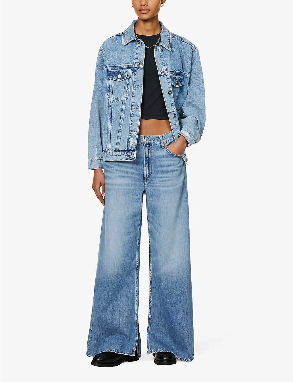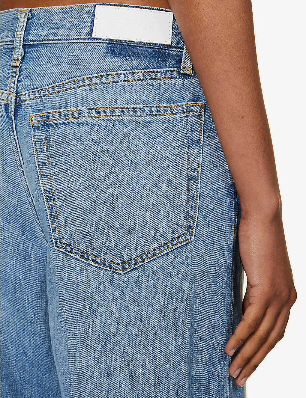 - Relaxed fit, mid-rise, wide leg, structured waistband with belt loops, five pockets, brand patch at back, curved yoke at back, mid-faded wash, contrast stitching, branded hardware