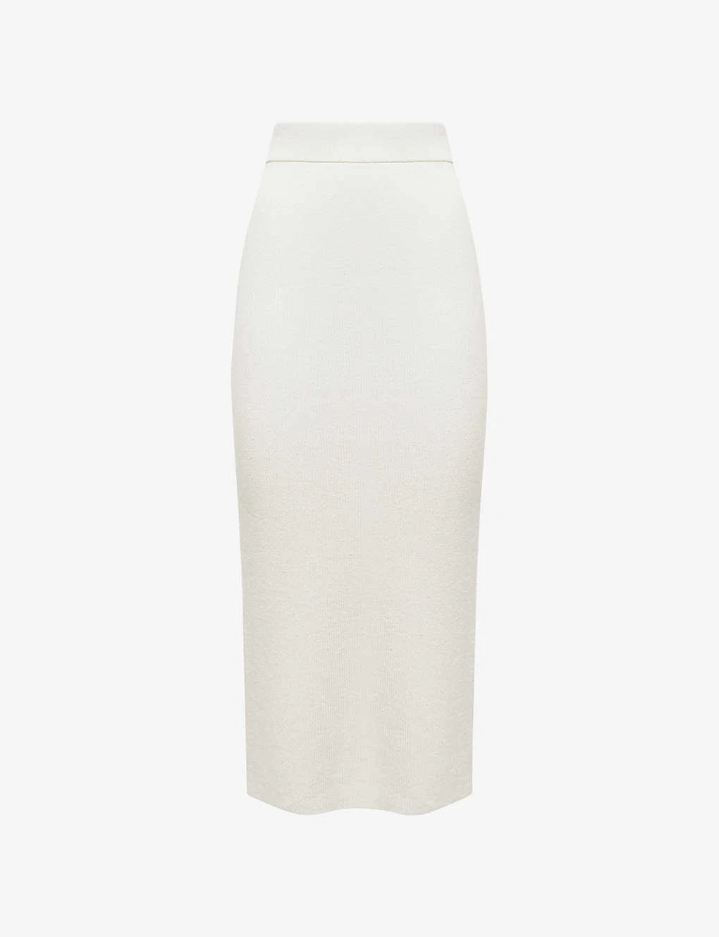 - High-rise, structured waistband, ribbed knit, fitted, midi length, split at back hem