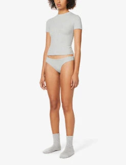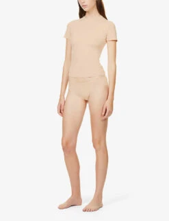 - High rise, fitted, brand-embroidered waistband, all-over ribbing