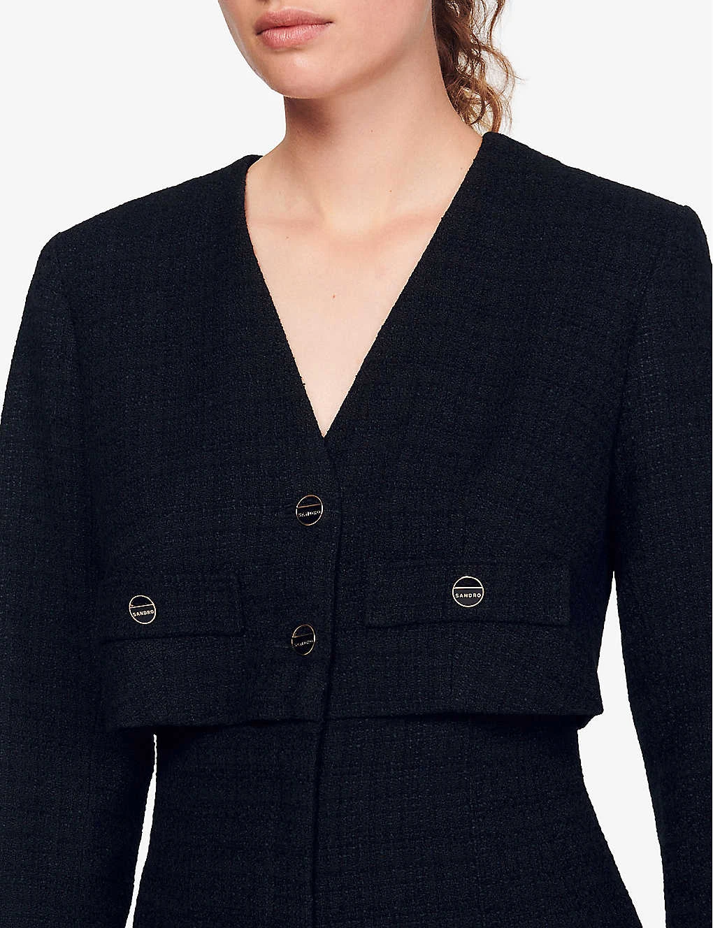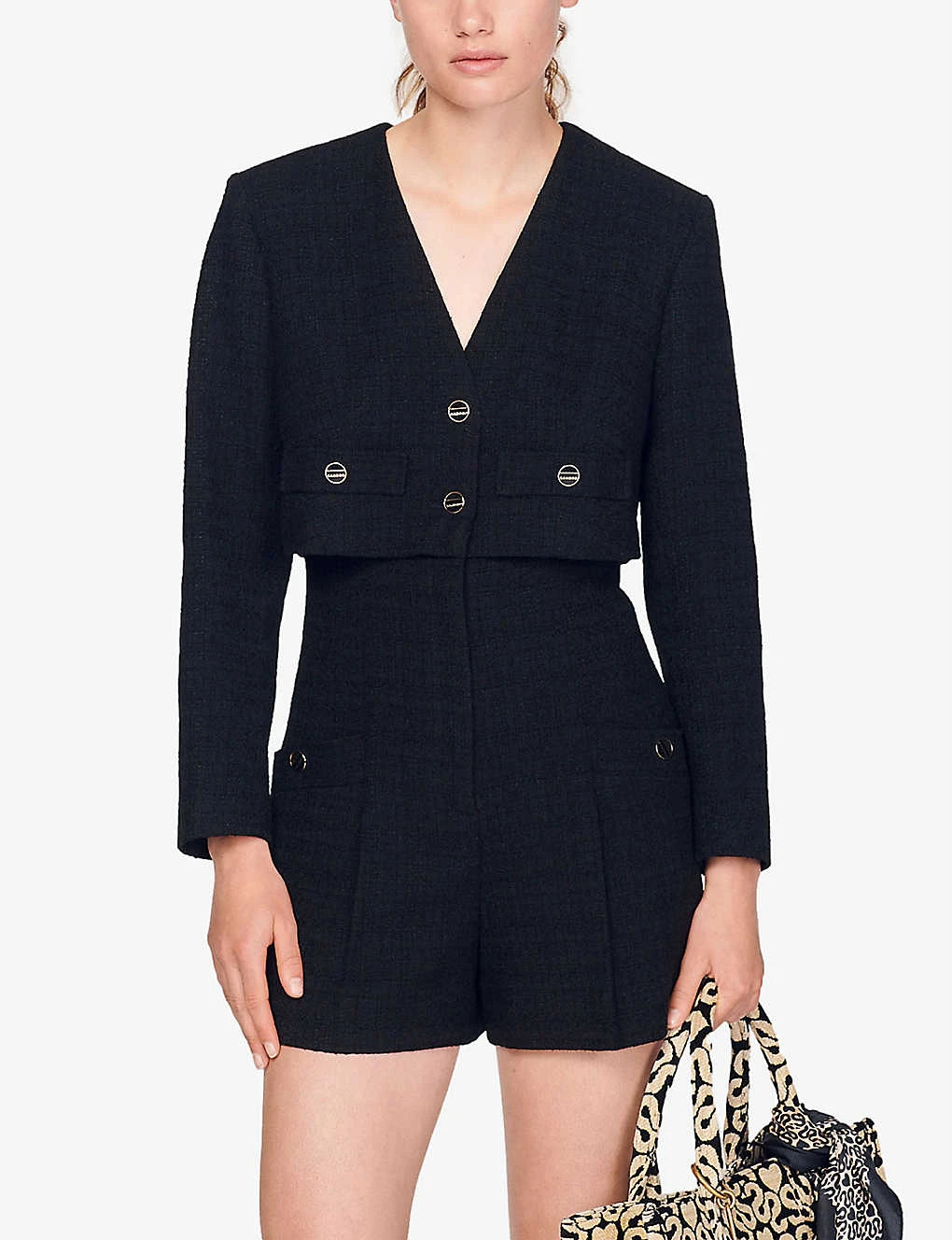 - Trompe l’œil jacket and shorts effect, V-neckline, four slip pockets, logo-embossed buttons, gold-tone hardware