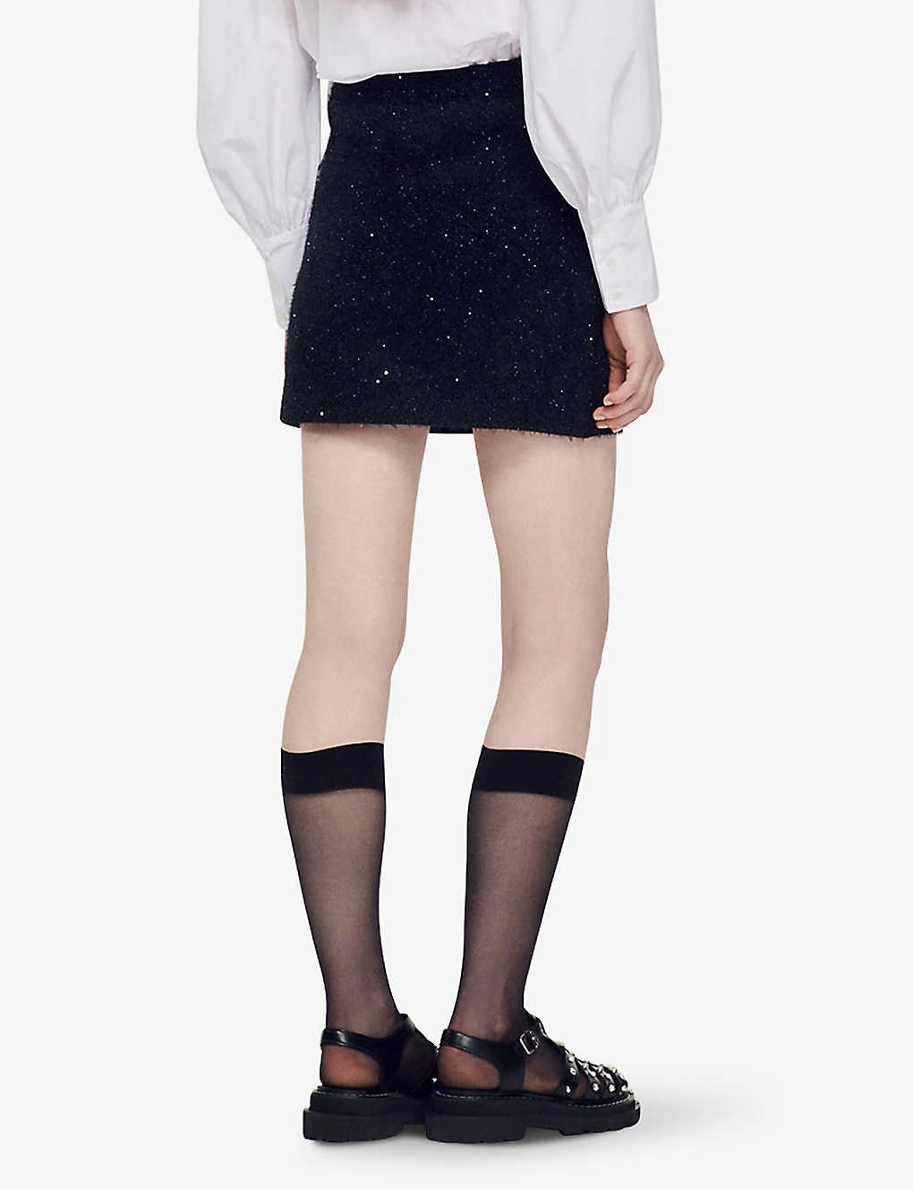- High waist, all-over sequin embellishments, tweed texture, two pockets with textured buttons to the front, A-line shape, mini length