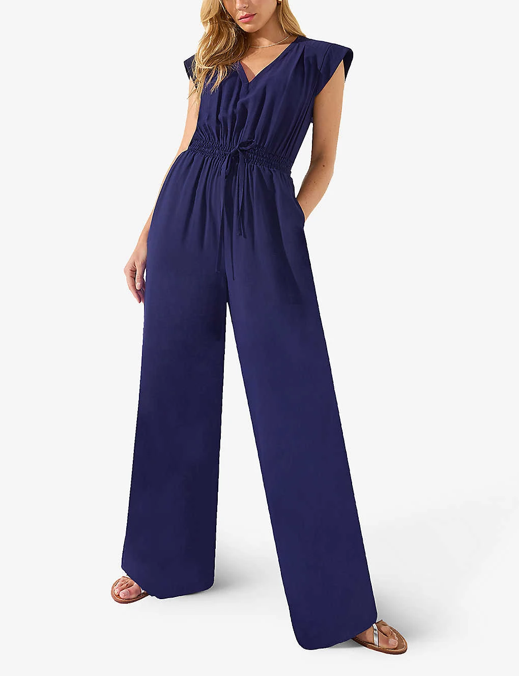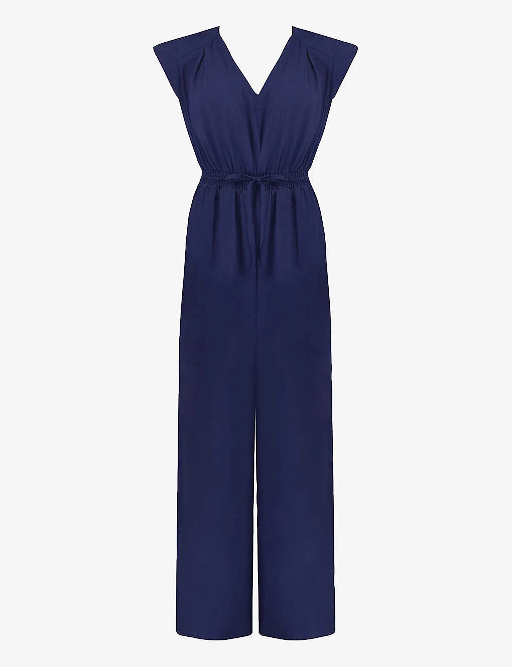 - V-neck, cap sleeves, drawstring shirred waist, wide-leg, high-rise, slip pockets