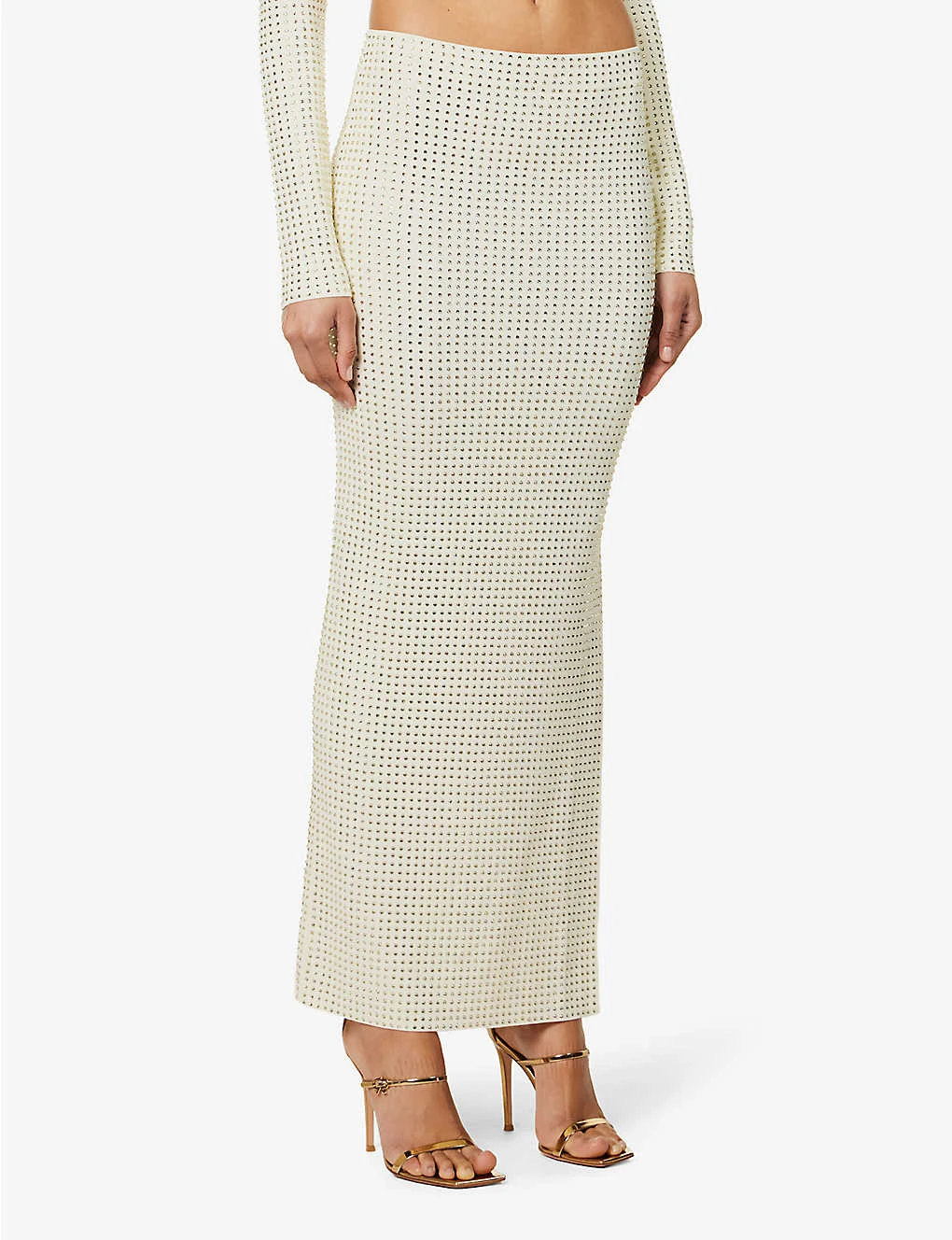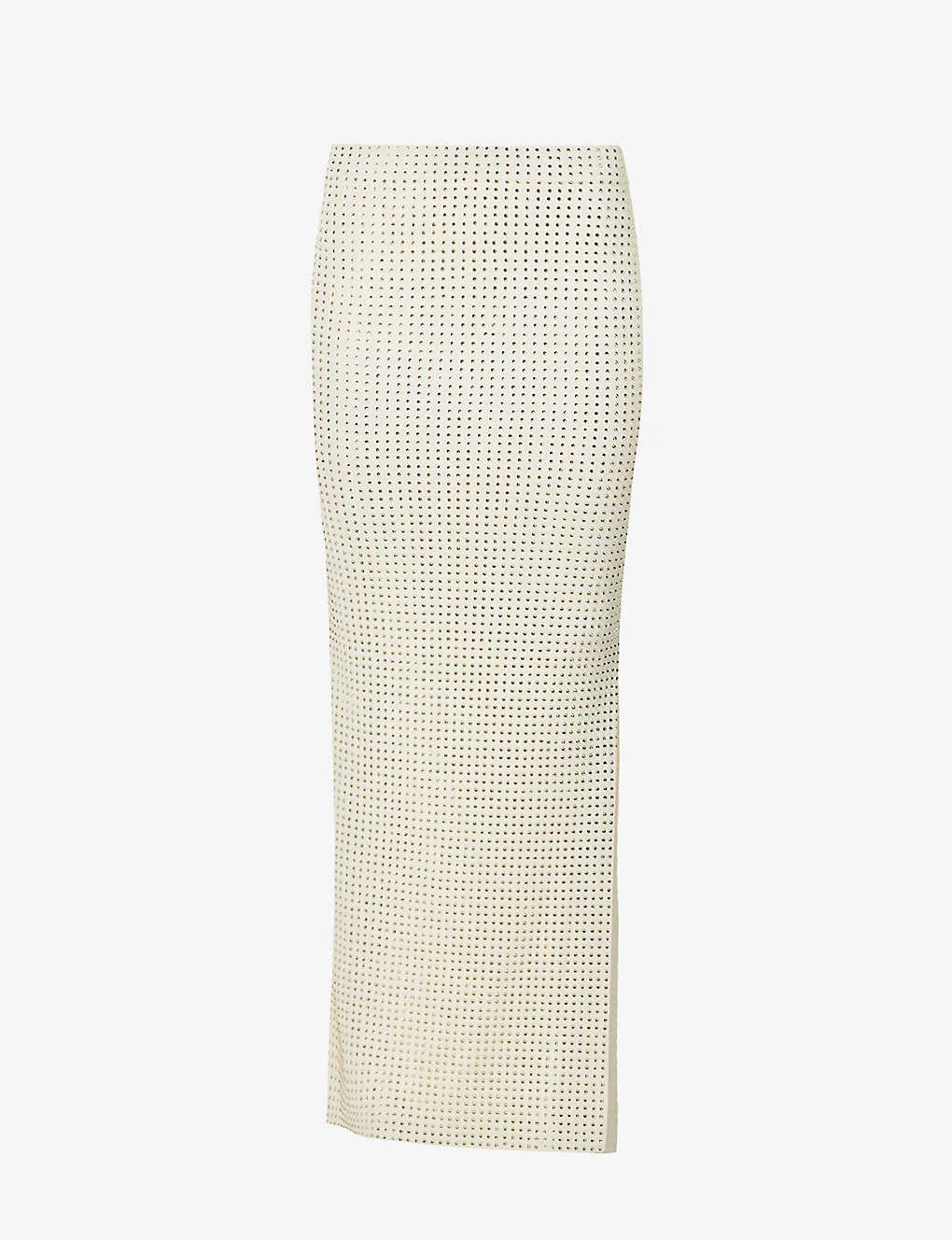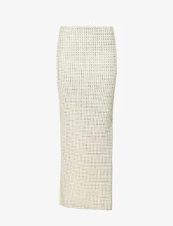 - Regular-fit, high-waist, elasticated waistband, all-over rhinestone-embellishment, high split at side