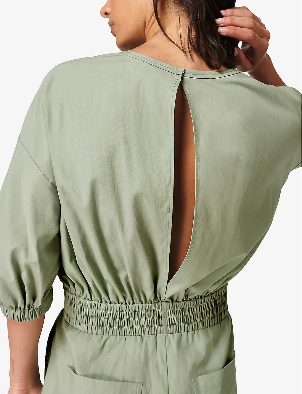 - Round neck, three-quarter length blouson sleeves, dropped shoulders, gathered waist, elasticated waistband, elasticated cuffs, peephole detail to the back, two patch pockets to the back, shorts with split side hems