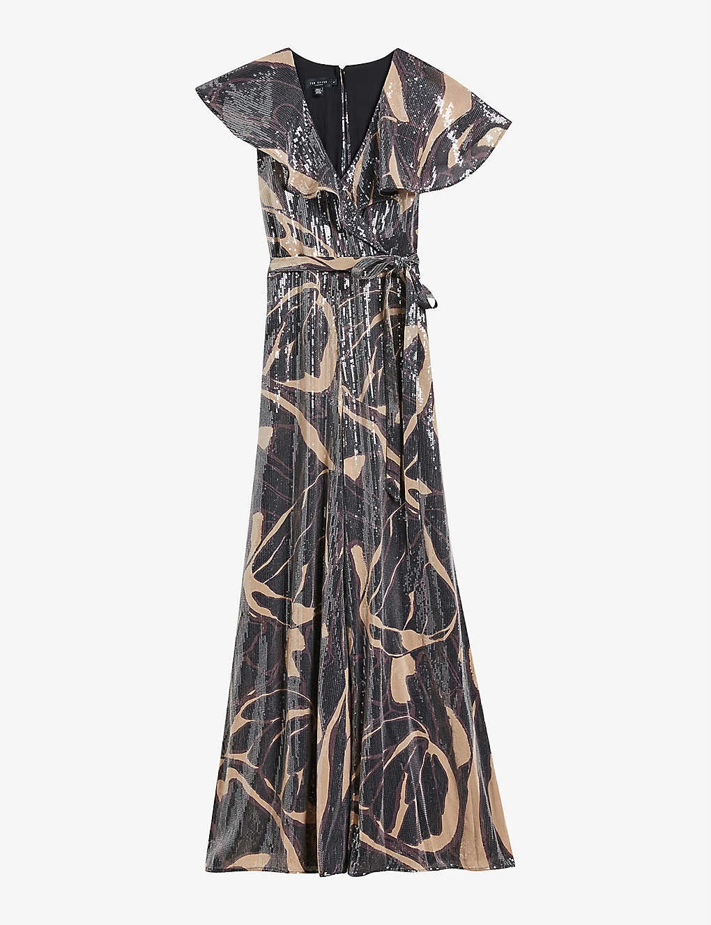- Fitted, V-neck, ruffle boarder at neckline, wide-leg, self-tie belt at front, all-over sequins, all-over abstract-print