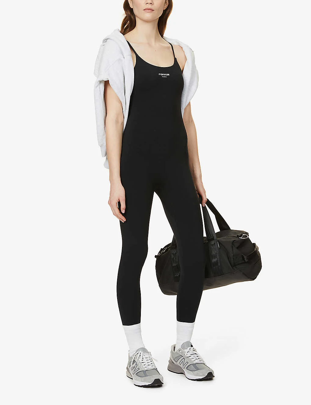 - Compression fit, full-length leg, scoop neck, shoulder straps, brand print at chest, four-way stretch, moisture wicking, squat proof