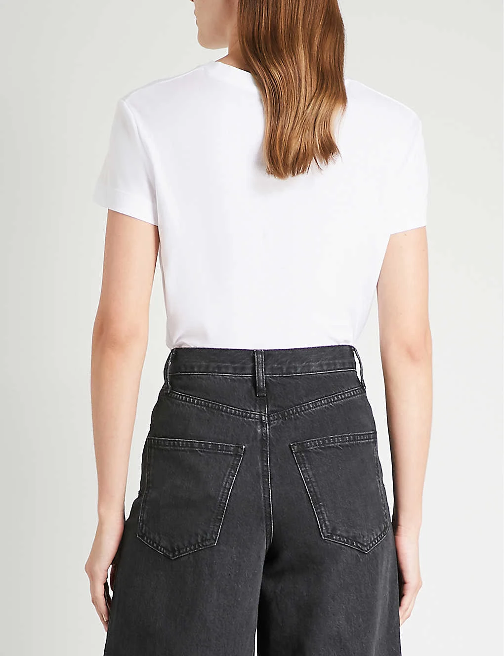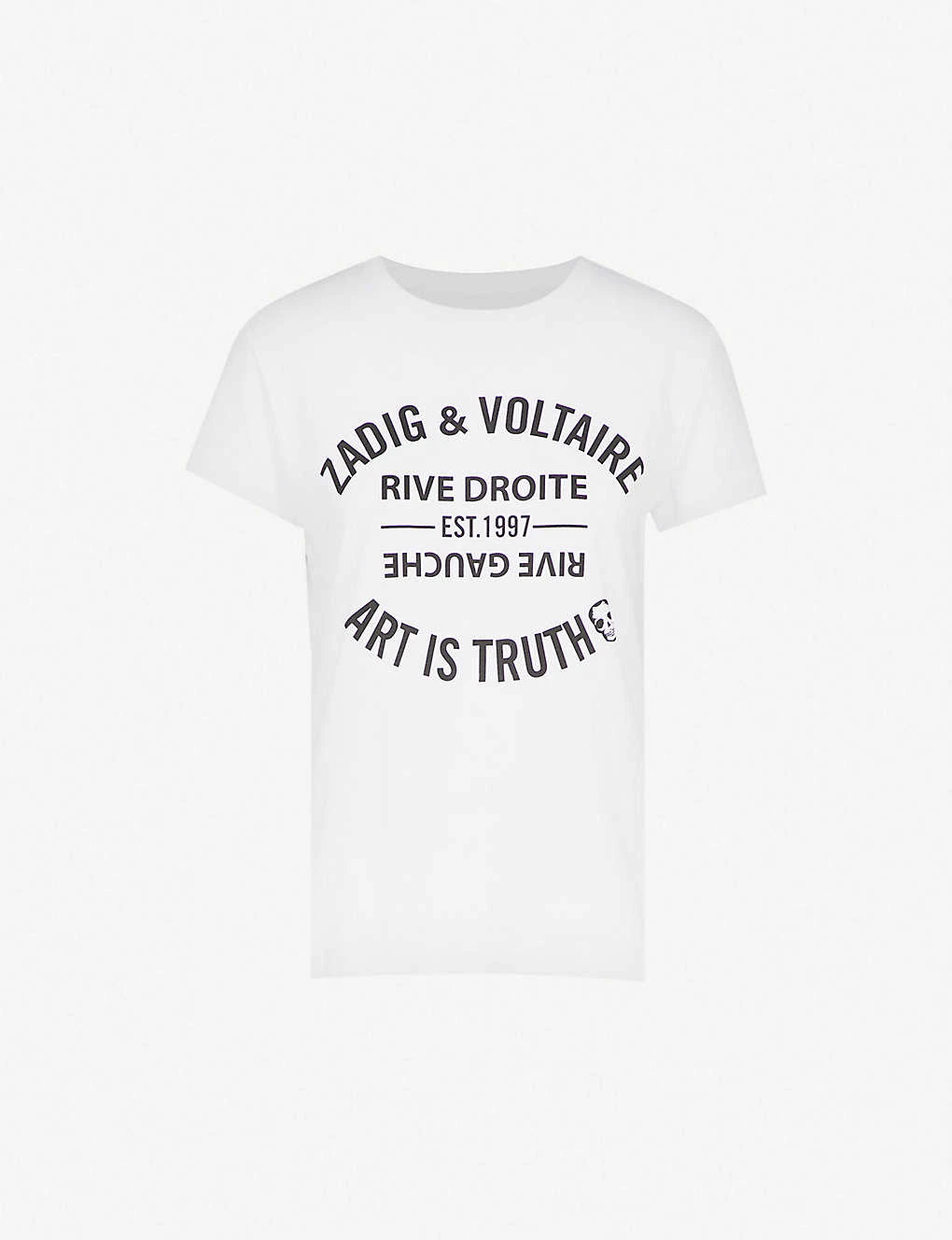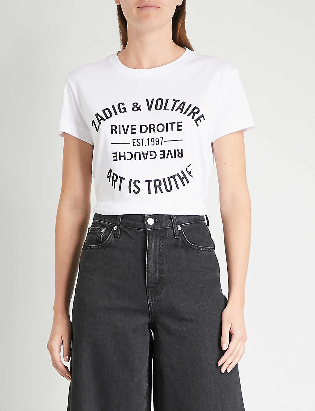 Zadig & Voltaire cotton T-shirt Slips on Round neck, short sleeves, logo-print at front, straight hem, hemline notches 100% cotton Machine wash True to size Size small: Length 25″” Model is 5ft 10″” and wears a size small