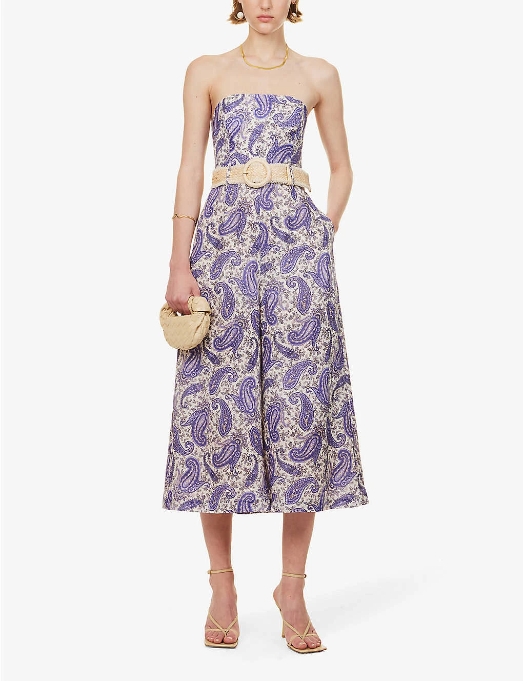 - Regular fit, straight across neckline, strapless, shirred panel at back, belt at waist, two slip pockets at front, paisley pattern